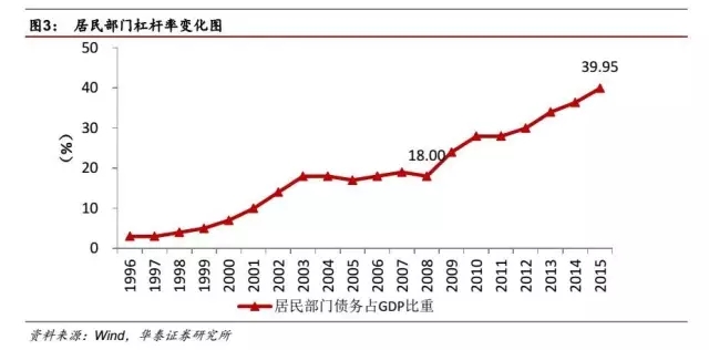 2014年以前的杠杆率数据我们仍采用社科院发布的资产负债表数据,可以看出98-03年快速上升,03-08年相对平缓,2008年金融危机之后我国居民部门杠杆率再次迅速攀升,七年之间增加了22个百分点。我们认为这与居民部门的债务结构紧密相关,住房抵押贷款作为居民消费贷款中最重要的组成部分,随着98年住房改革其规模迅速扩大,而2008年房地产市场的繁荣再次加速了其规模的扩大。根据中国人民银行发布的《2015年金融机构贷款投向统计报告》,2015年末个人购房贷款余额为14.18万亿元,同比增长23.2%,比各项贷款增速高8.9个百分点。