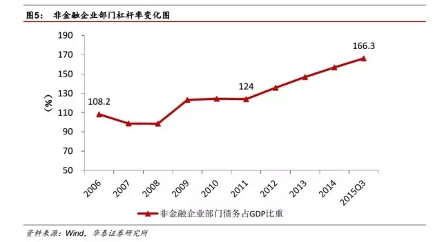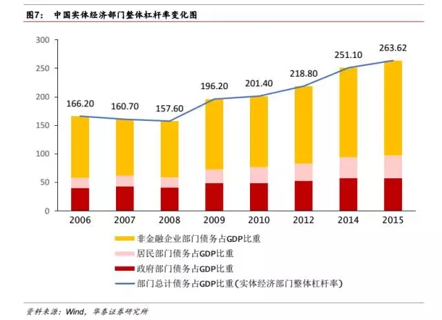加总以上三个部门的杠杆率,得出2015年底我国实体经济部门整体杠杆率已达到263.62%。较为明显的变化是,自2008年以来杠杆率水平快速上升,增加了105个百分点,过快的杠杆率增长速度与相对较高的杠杆率水平或是政府考量的出发点。