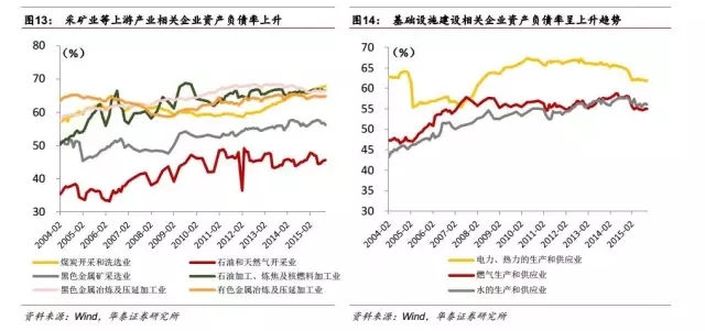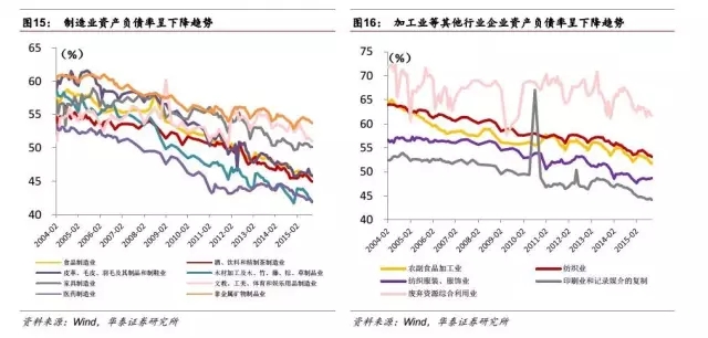 工业企业中除了少数上游产业相关企业(如采矿业、金属冶炼加工业等)以及基础设施建设相关企业(如电力、热力、燃气、水的生产和供应业)资产负债率呈上升趋势外,其他制造业等大部分行业都呈下降趋势;上市公司中采掘、化工、钢铁、纺织服装、农林牧渔等传统行业去杠杆明显,其他医药生物、休闲服务等新兴产业杠杆率呈上升趋势,尤其是房地产行业“加杠杆”明显;国有企业中,大中型企业资产负债率明显偏高,亏损企业资产负债率高于盈利企业,地方企业高于中央企业。