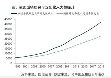 第二个关键词是“消费升级”。随着收入水平的不断提升,我国居民将对医药和医疗服务保有巨大需求,同时将有着充分的支付意愿和能力。