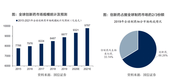 作为医药行业中“科技含量”更高的赛道,创新药市场空间巨大,技术领域广阔。当前全球制药细分市场构成中,创新药占据2/3份额,据行业内估计,2020年全球创新药市场规模约9300亿美元。