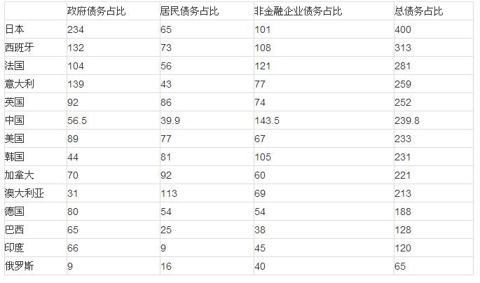 世界主要经济体实体经济债务结构比较(占GDP比重) 单位:%
