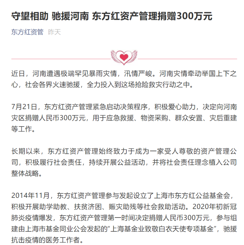 7月21日,东方红资产管理紧急启动决策程序,积极爱心助力,决定向河南灾区捐赠人民币300万元,用于应急救援、物资采购、群众安置、灾后重建等工作。