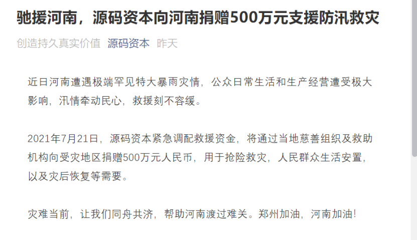 源码资本也在7月21日,紧急调配救援资金,将通过当地慈善组织及救助机构向受灾地区捐赠500万元人民币,用于抢险救灾,人民群众生活安置,以及灾后恢复等需要。
