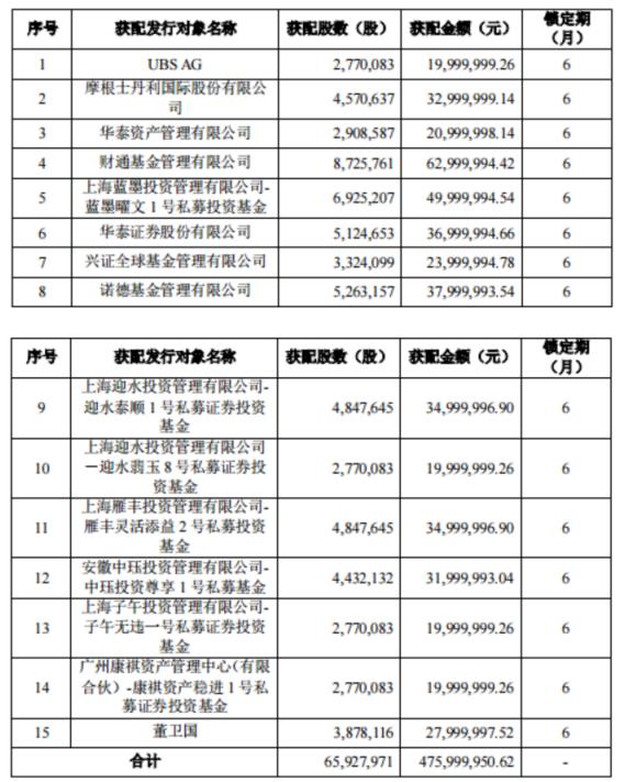 【苏奥传感披露定增结果:迎水投资、摩根士丹利及诺德基金等参投】财联社7月22日讯,苏奥传感公布2020年向特定对象发行股票发行情况报告书,确定本次发行价格7.22元/股,发行股数6592.8万股,募集资金总额4.76亿元。本次发行对象最终确定为15家。发行配售结果如下: