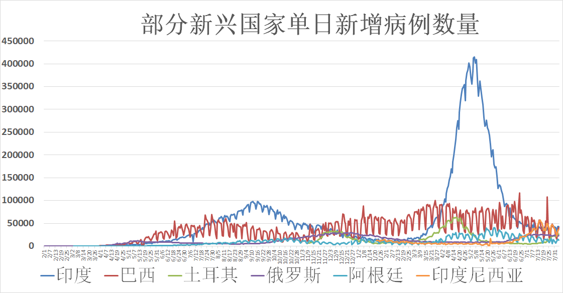 主要新兴市场国家中,印度单日新增病例已趋于稳定,累计确诊病例达31,812,114例,其他国家方面,巴西(20,026,533例)、俄罗斯(6,296,570例)、阿根廷(4,975,616例)、印度尼西亚(3,568,331例)疫情较严重。