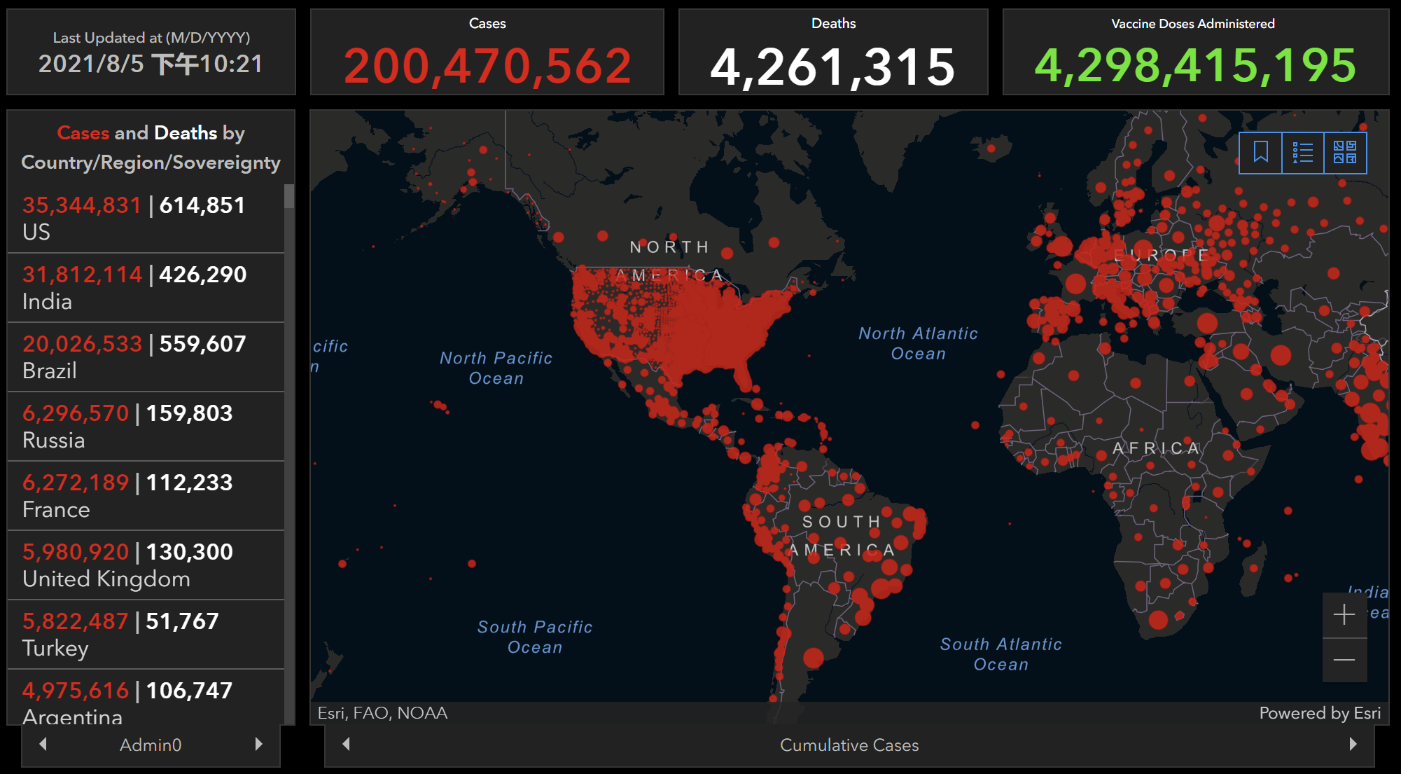 财联社(上海,编辑 阿乐)讯,美国约翰斯·霍普金斯大学即时统计数据显示,截至北京时间8月5日23时59分,全球新冠肺炎确诊病例上升至200,470,562例,其中死亡病例达到4,261,315例。