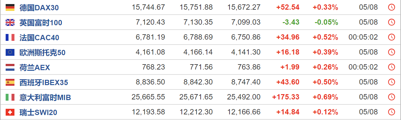 美国三大股指盘内悉数上涨,截至发稿,道琼斯指数涨0.54%,标普500指数涨0.40%,纳斯达克指数涨0.65%。欧洲主要股指多数收涨。