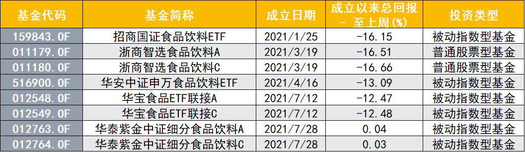 虽然今年以来食品饮料板块整体表现乏善可陈,仍有不少公募选择在板块估值调整时入场布局。今年以来,围绕该主题共有4只被动指数基金和1只普通股票基金成立。然而,截至上周,跟随着大消费板块的长期超跌,这些新基金的收益情况也不甚理想。