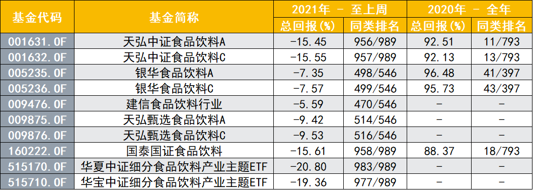 去年消费大行情下颇受关注的食品饮料主题基金,今年以来的表现一直不太乐观。根据Wind数据,2021年以前发行的食品饮料主题基金共计7只(A/C类合并),这类主题基金在2020年的年收益普遍达到了90%左右,而在2021年则出现了业绩大逆转,在同类基金中的排名急速下滑。