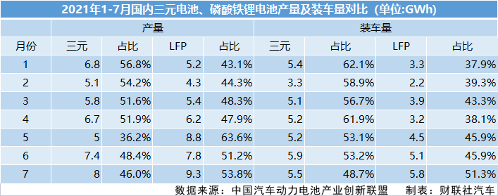 中汽协数据显示,1-7月,我国动力电池装车量累计63.8GWh,同比累计上升183.5%。其中三元电池装车量累计35.6GWh,占总装车量55.8%,同比累计上升124.3%;磷酸铁锂电池装车量累计28.0GWh,占总装车量43.9%,同比累计上升333.0%。