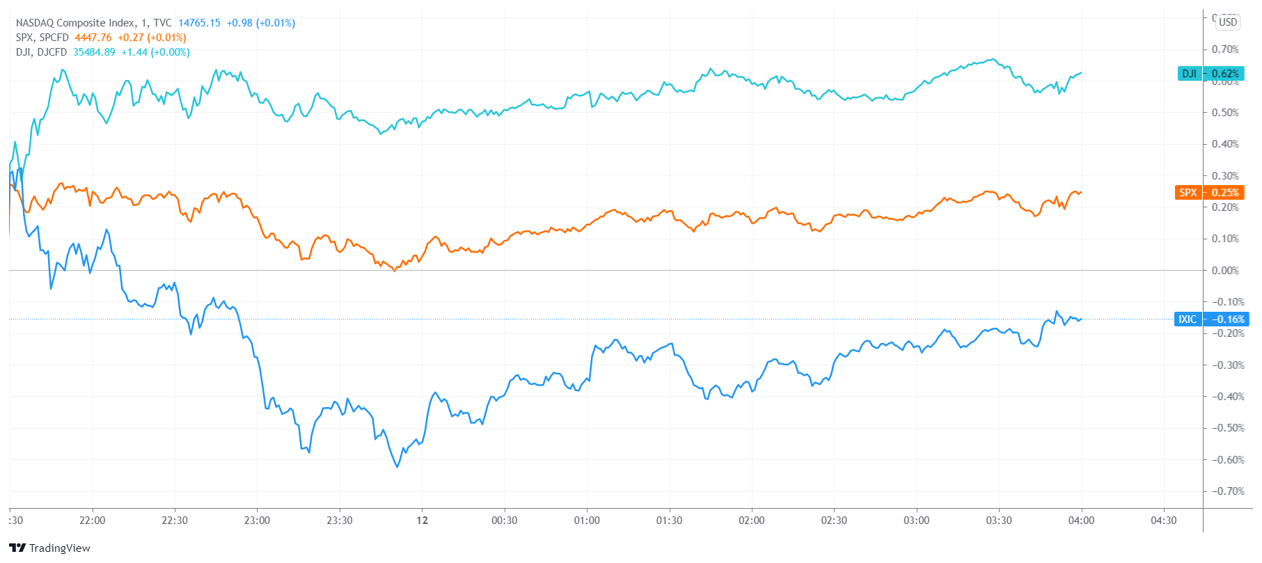 (标普500指数、纳指、道指分钟线图,来源:TradingView)