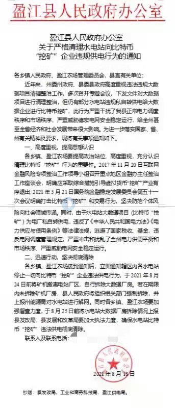 【云南盈江县人民政府:辖区内各水电站需在8月24日前自行拆除比特币矿机厂房】财联社|区块链日报20日讯,云南盈江县人民政府办公室有关工作人员向《区块链日报》记者确认,政府办公室近日发布关于严格清理水电站向比特币“挖矿”企业违规供电的通知。通知指出,各乡镇、盈江农场需立即通知辖区内各水电站停止一切向比特币“挖矿”企业违法供电行为,于2021年8月24日前将矿机搬离电站厂区,自行拆除大数据厂房。若在期限内未拆除矿机厂房,县人民政府将组织相关部门强行拆除,并上报州能源局对水电站进行解网。同时各乡镇、盈江农场要加强督查力度,于8月25日前将水电站大数据厂房拆除情况上报县发改局,县发展和改革局要加大执法力度,确保水电站比特币“挖矿”违法供电彻底清除。(记者 徐赐豪)