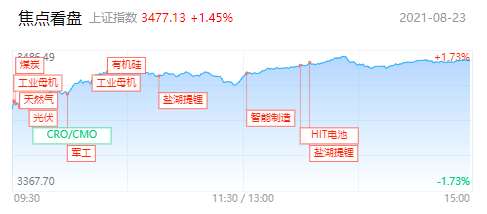 指数方面,截至收盘,沪指涨1.45%,报收3477点;深成指涨1.98%,报收14535点;创业板指涨3.16%,报收3293点。