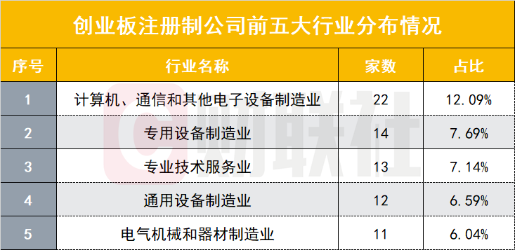 从上市公司的产业结构来看,新兴产业占比较高,行业集聚效应明显。截至8月20日,创业板新增182家注册制上市公司中,有157家属于高新技术企业,占比达到86%。182家公司分布于37个行业,前五大行业公司数量占比高达40%,分别是计算机/通信和其他电子设备制造业(22家)、专用设备制造业(14家)、专业技术服务业(13家)、通用设备制造业(12家)、电气机械和器材制造业(11家)。
