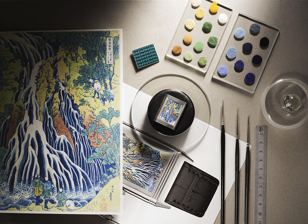积家今年推出的REVERSO TRIBUTE ENAMEL翻转系列珐琅腕表,为了生动再现葛饰北斋的木刻版画名作《诸国瀑布览胜 下野黑发山之瀑》,珐琅工艺师自行研发工艺,运用珐琅工艺模仿木版画技巧,令微绘呈现出与珐琅截然不同的特殊质感,进而复制出原作中微妙的“色彩渐变技法”(bokashi)以展现细腻色彩。