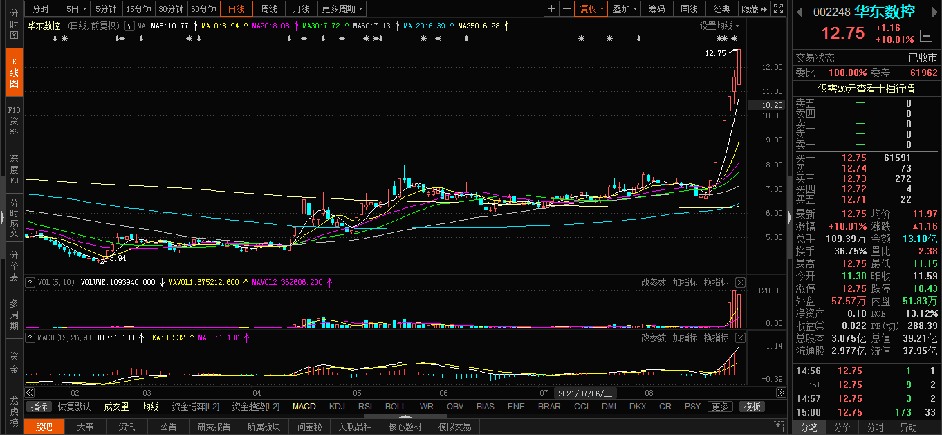 个股方面,市场高度在3连板,华东数控、盛通股份、金石资源、青海华鼎、兆新股份等标的均是此前有过连续涨停或者已经处于较高位置的个股。今日共有11只创业板股涨停,其中铜牛信息、恒锋工具2连板。
