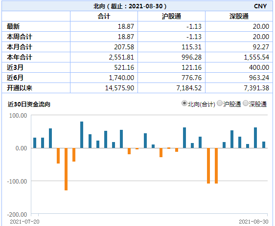 北向资金,今日净买入18.87亿元。其中。沪市净卖出1.13亿元,深市净买入20亿元。