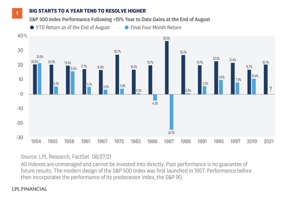 在一份报告中,LPL Financial首席市场策略师瑞安•德特里克 (Ryan Detrick) 给出了一张可以追溯至1954年的图表。图表显示,标普500指数在过去五次截至8月底涨超15%的情况下,有四次在当年剩下的四个月里录得积极表现。