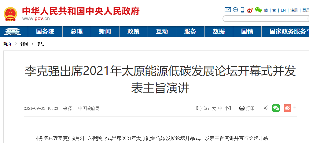 国务院总理李克强9月3日以视频形式出席2021年太原能源低碳发展论坛开幕式,发表主旨演讲并宣布论坛开幕。