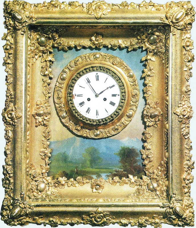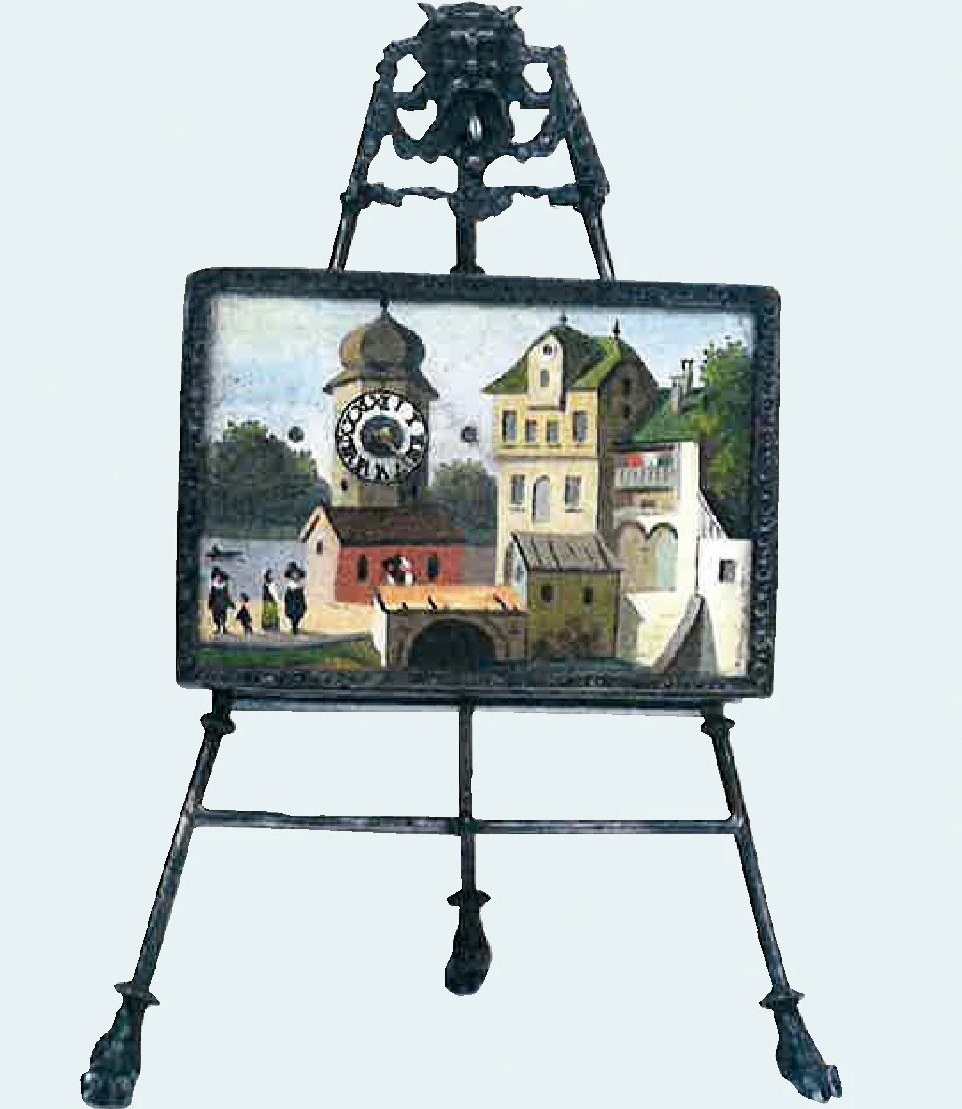 在古典主义时期还出现过一种微型画钟,作为稀奇事物值得一提。它安装在一个小画架上,画架顶部装饰着丑陋的魔鬼头像,带蹄形支架脚,画面展示的村庄场景里有一座教堂钟楼,超大表盘便于读取时间。