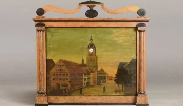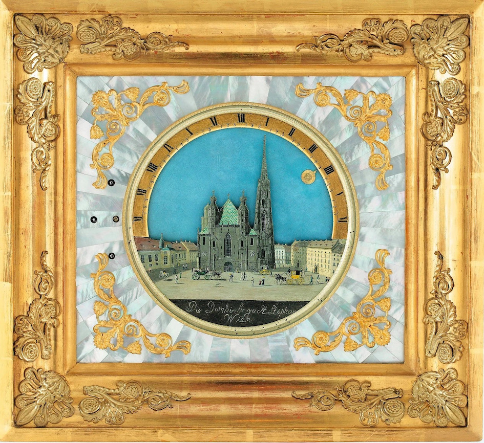 有两台宫廷画钟极其罕见,不属于任何类别。其中一台在椴木上采用浅浮雕技术,详细呈现了极受喜爱的绘画图案之一——维也纳圣斯蒂芬大教堂的外观。教堂的塔尖几乎就要碰到表盘上的时标,超过半个圆弧的鎏金刻度盘包围整个教堂,显示数字VI(上午)至VI(傍晚),如同镶嵌的边框。一个镀金太阳与一个镀银月亮在绘制的天空中沿着刻度弧转动,尖端指示时间。这幅画作可以追溯到1792年Carl Schütz的一幅铜版画,其表盘是独一无二的,机芯配备了非同寻常的镰型擒纵,都安装在镀金雕刻的外壳内,外壳表面附有珍珠母贝,表面几乎呈正方形。