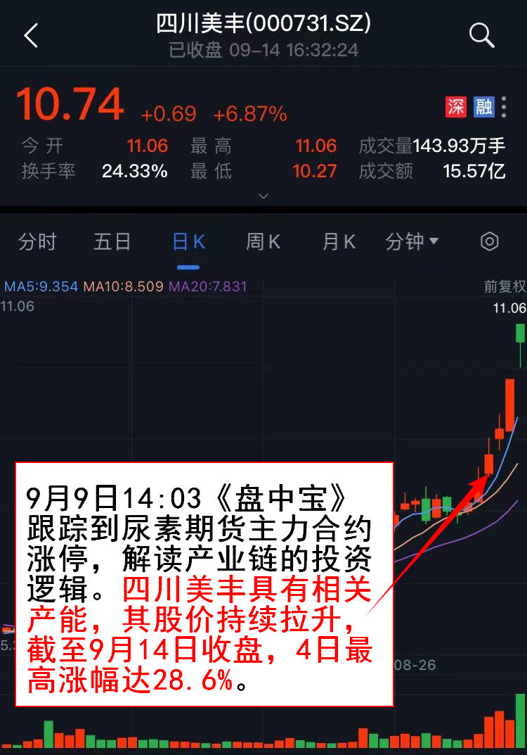 9月9日14:03《盘中宝》跟踪到尿素期货主力合约涨停,解读产业链的投资逻辑,指出产品供应偏紧,需求端工业需求或将弥补农需下滑的影响,尿素价格有望维持高位。四川美丰具有相关产能,其股价持续拉升,截至9月14日收盘,4日最高涨幅达28.6%。