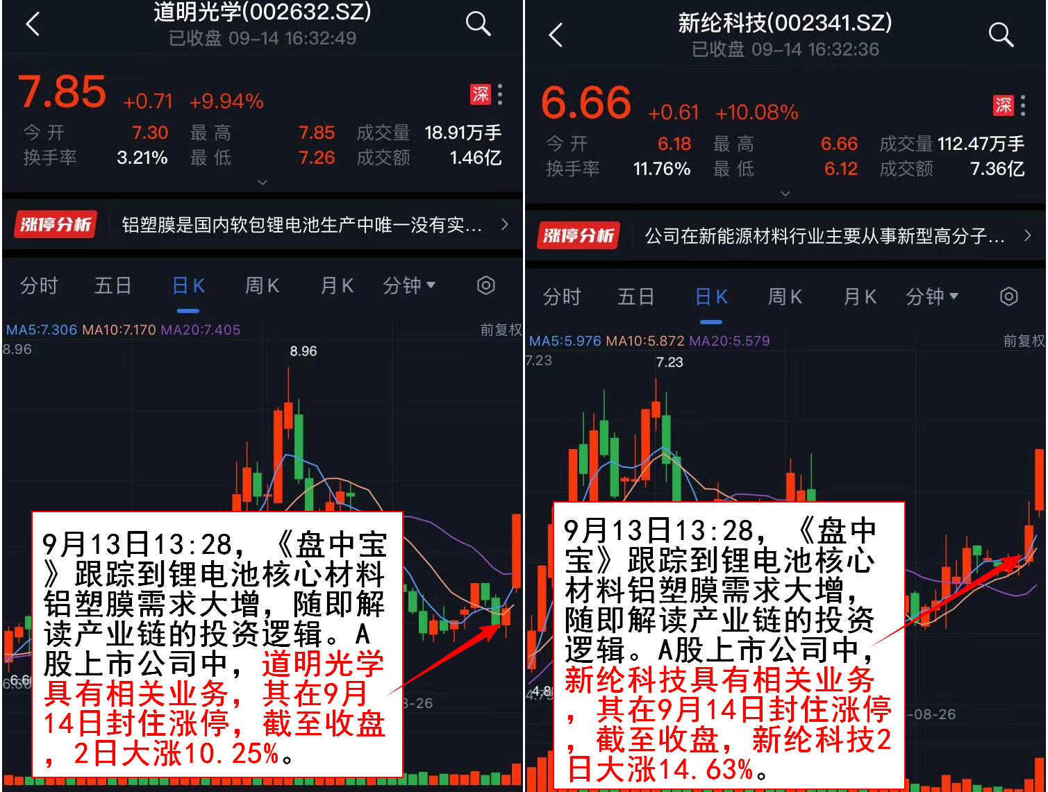 9月13日13:28,《盘中宝》跟踪到锂电池核心材料铝塑膜需求大增,随即解读产业链的投资逻辑,提及2025年铝塑膜出货量将达到7.6亿平方米,复合增长率25.9%,前景喜人。A股上市公司中,新纶科技、道明光学具有相关业务,其在9月14日双双封住涨停。截止9月14日收盘,新纶科技2日大涨14.63%,道明光学2日大涨10.25%。