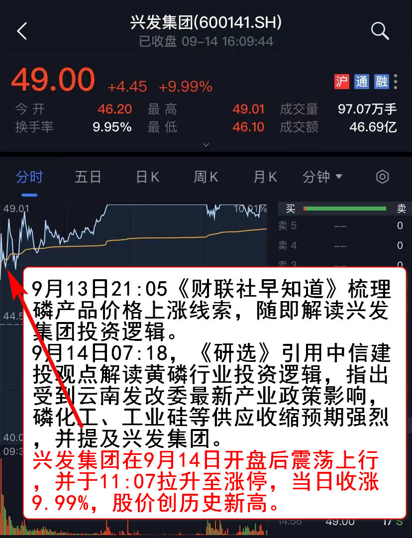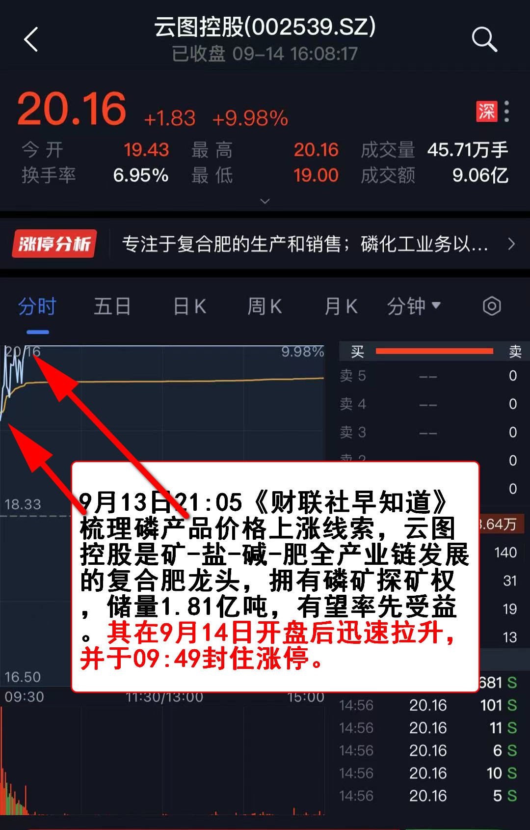 9月13日21:05《财联社早知道》梳理磷产品价格上涨线索,云图控股是矿-盐-碱-肥全产业链发展的复合肥龙头,拥有磷矿探矿权,储量1.81亿吨,有望率先受益。其在9月14日开盘后迅速拉升,并于09:49封住涨停。