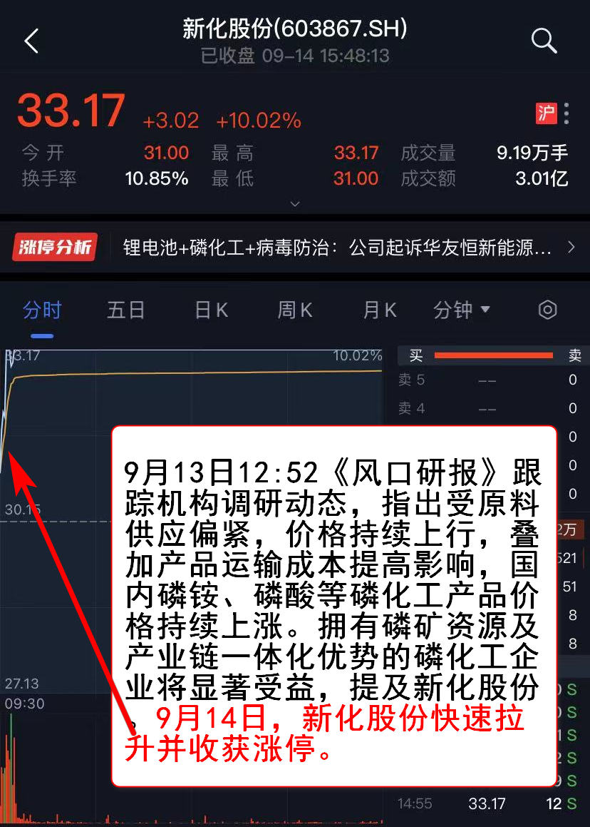9月13日12:52《风口研报》跟踪机构调研动态,指出受原料供应偏紧,价格持续上行,叠加产品运输成本提高影响,国内磷铵、磷酸等磷化工产品价格持续上涨。拥有磷矿资源及产业链一体化优势的磷化工企业将显著受益,提及新化股份。9月14日,新化股份快速拉升并收获涨停。
