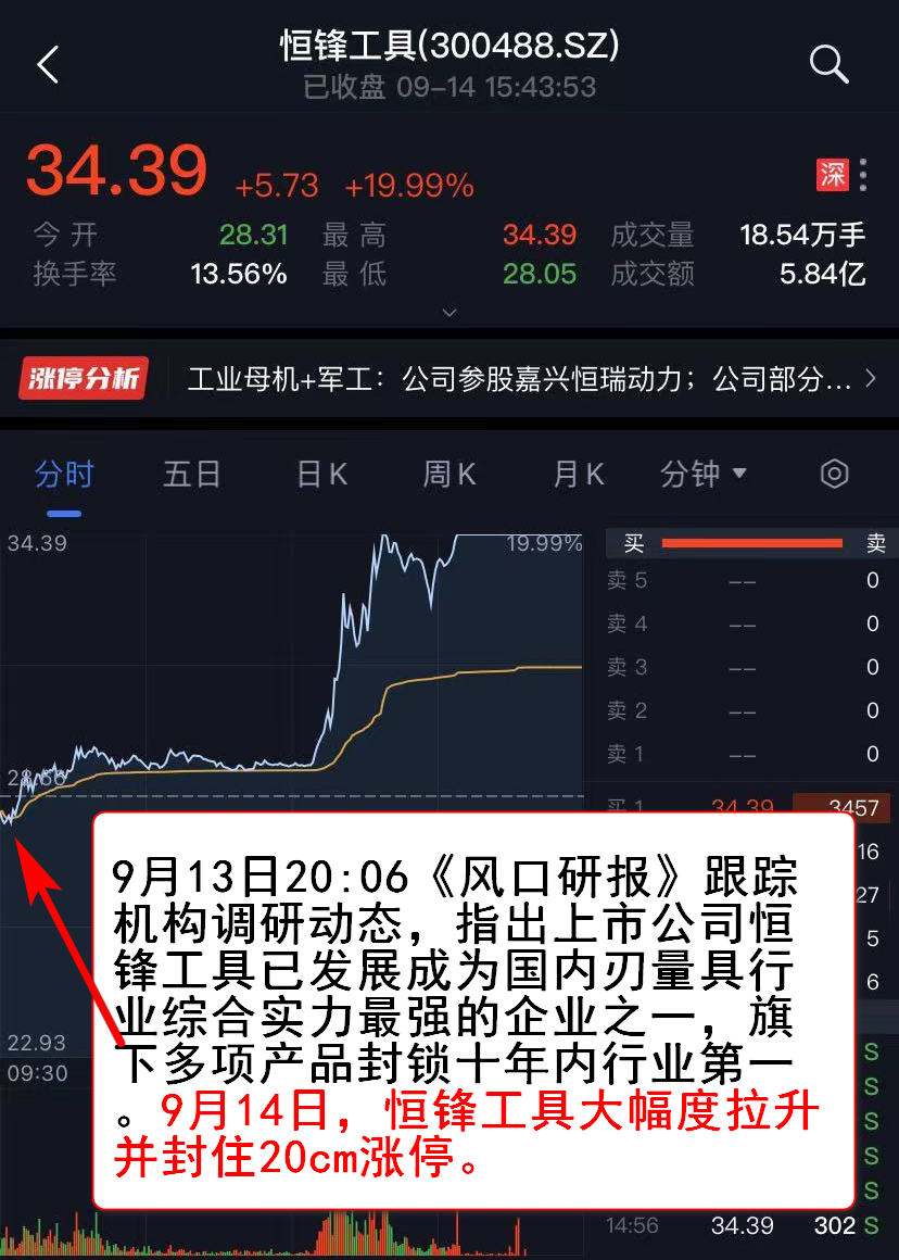 9月13日20:06《风口研报》跟踪机构调研动态,指出上市公司恒锋工具已发展成为国内刃量具行业综合实力最强的企业之一,旗下多项产品封锁十年内行业第一。9月14日,恒锋工具大大幅拉升并封住20cm涨停。