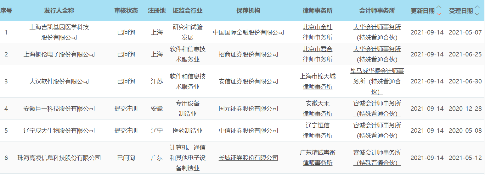 截至9月14晚,共有650家公司科创板上市申请获受理,6家公司发审状态更新。