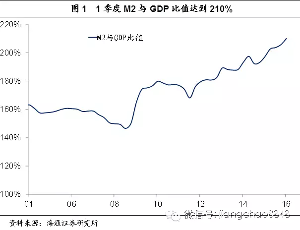 今年1季度GDP增速为6.7%,GDP名义增速为7.1%,但是广义货币M2增速达到13.4%,远远高于经济增速。如果统计M2和GDP的比值,08年末时是150%,到15年末上升到206%,而16年1季末上升到210%,也就是经济整体的杠杆率越来越高。