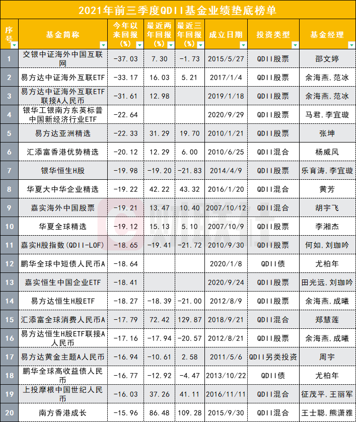 上述基金外,还有27 只 QDII 基金年内回报也低于-10%,包括汇添富香港优势精选、银华恒生H股、华夏大中华企业精选、嘉实海外中国股票、华夏全球精选、嘉实H股指数(QDII-LOF)等。
