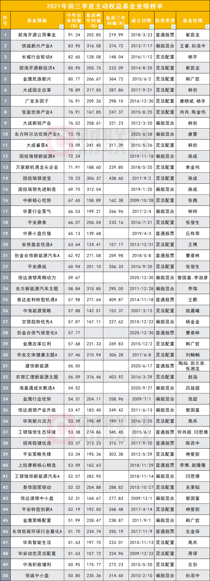 从数据看,2021年前三季度,业绩优异的,依然多为行业“新秀”。其中,前海开源公用事业、信诚新兴产业、长城行业轮动,这3只规模均不算大的基金,在今年前三季度收益率分别达到了91.24%、83.95%、82.65% ,分别位居主动权益产品上半程的冠、亚、季军。紧随其后的前海开源新经济,年内收益率也达到了80.95%,该产品背后掌舵人依然为崔宸龙。