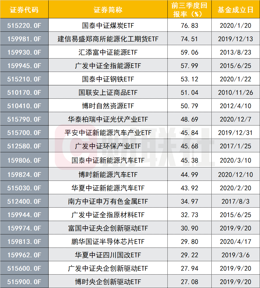 三季度以来,以煤炭为代表的顺周期板块表现优异。Wind数据显示,截至9月30日,今年以来非货ETF收益率超过50%的均与周期相关。