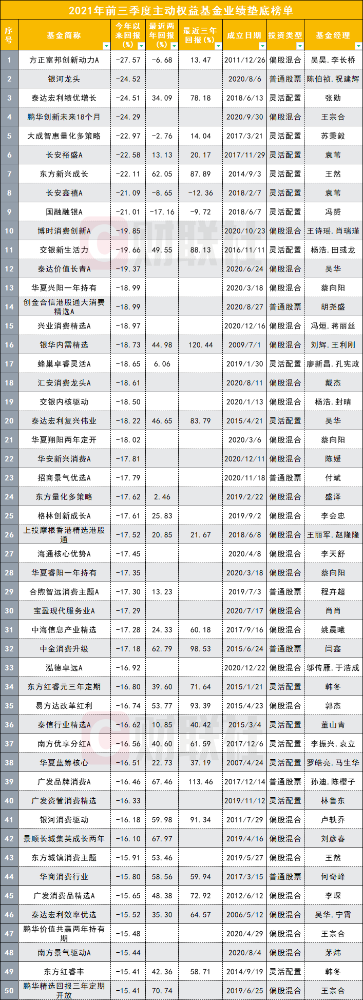 在前三季度权益基金业绩垫底的榜单中,吴昊、李长桥共同管理的方正富邦创新动力,以-27.57%的回报“实力垫底”。一众明星基金经理中,王宗合管理的多只产品均在榜单倒数。跌落“神坛”的,也许不止王宗合一人。从今年前三季度的数据看,蔡向阳、邬传雁、萧楠、刘彦春等管理的产品也面临着短期“失灵”的困境。