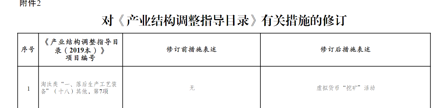2019年4月8日,在《产业结构调整指导目录(2019年本,征求意见稿)》,虚拟货币“挖矿”活动被列入淘汰类产业,属于“落后生产工艺装备”类目,且挖矿活动还被列入应“立即淘汰”的产业。