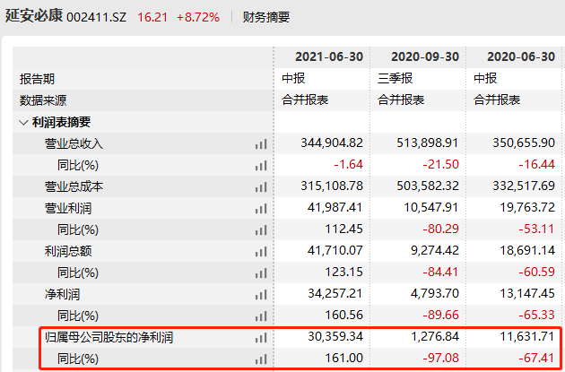 曾经主营医药的延安必康2021年上半年净利润同比增长161%,但仅在三季度,其净利润同比增长数值突然飙高至4599%。其中固然有延安必康2020年三季报净利润低基数(0.13亿)的影响,但从绝对数值来看,三季度其预告净利润中值达到5.75亿元,几乎为上半年归母净利润的两倍。