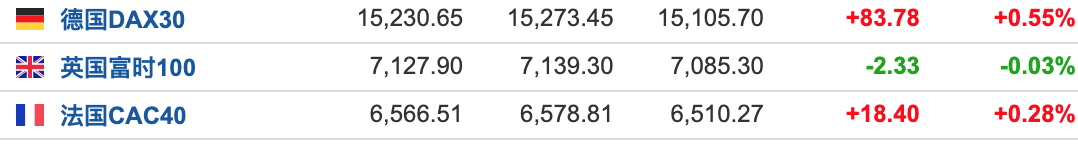 正在交易中的欧洲市场涨跌不一,截至发稿,英国富时100指数跌0.03%,法国CAC40指数涨0.28%,德国DAX30指数涨0.55%。
