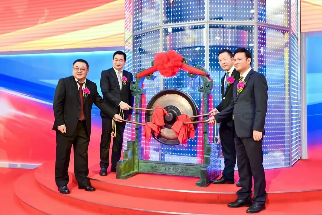 新华社总经理室总经理田舒斌(后左一),上海证券报党委书记、董事长叶国标(后右一),富国基金管理有限公司总经理陈戈(前左一),中证指数有限公司总经理陆素源(前右一),共同为国货ETF上市敲锣。
