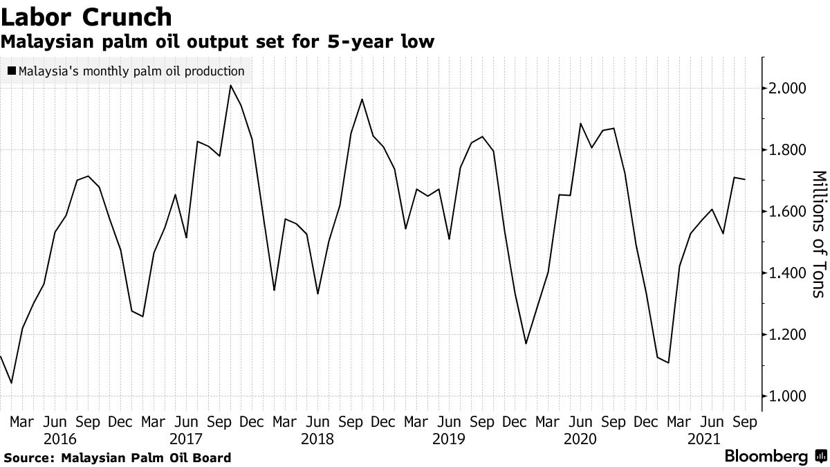 财联社(上海,编辑 卞纯)讯,全球第二大棕榈油生产国马来西亚今年的棕榈油产量或将创下五年来最低水平,因该国种植者正努力应对有史以来最严重的劳动力短缺问题,而且低产量可能会持续到明年3月。