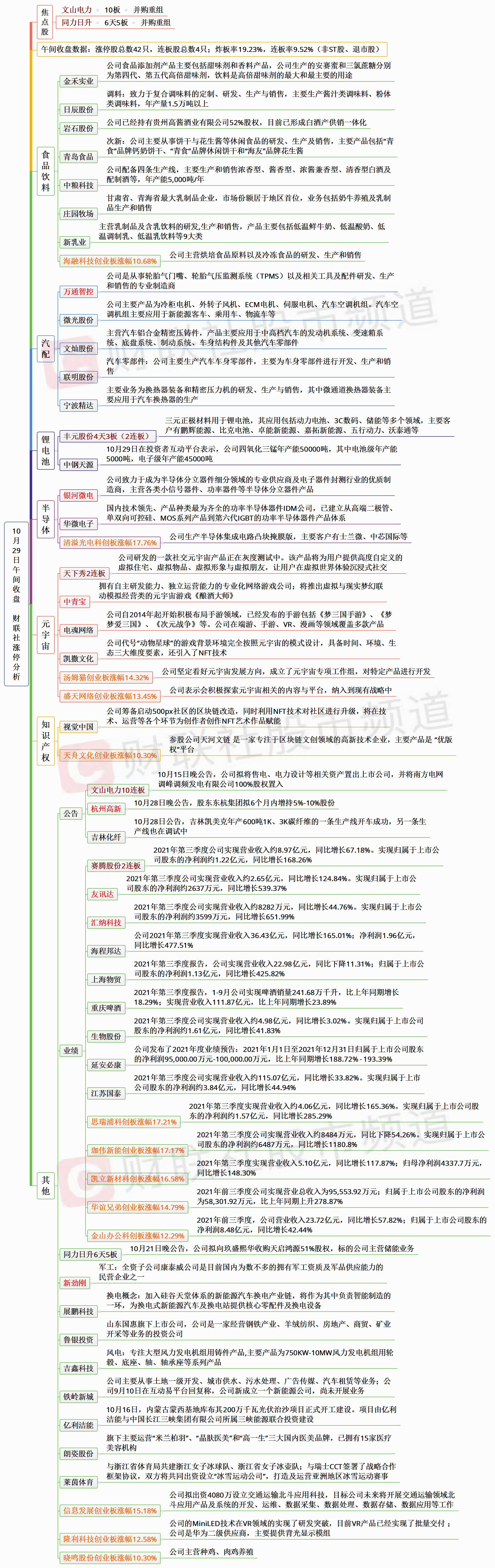 【10月29日午间涨停分析】今日午盘两市共42股涨停,连板股总数4只,10股封板未遂,封板率为81%(不含ST股、退市股及未开板新股)。个股方面,并购重组的文山电力10连板、同力日升6天5板,锂电股丰元股份4天3板,元宇宙概念股天下秀2连板、中青宝创业板首板,汽配股赛腾股份2连板、万通智控创业板首板,半导体板块银河微电科创板首板。盘面上,新能源板块回调释放资金,食品饮料板块回暖。