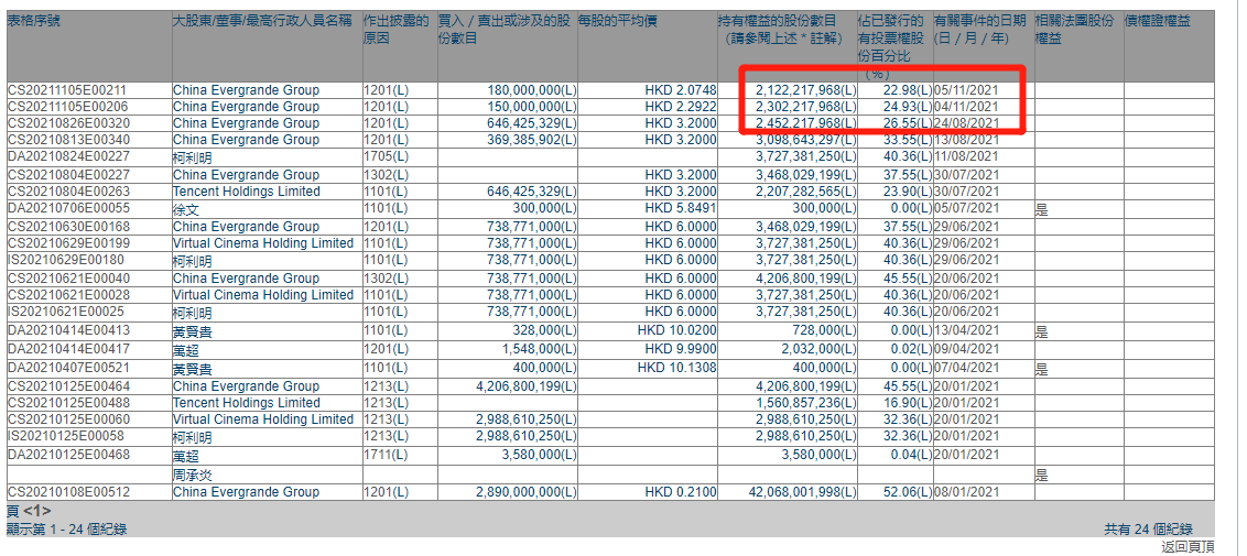 【腾讯接替恒大成恒腾网络第一大股东】财联社11月5日电,港交所权益资料显示,中国恒大(03333)减持3.3亿股恒腾网络(00136),交易完成后,腾讯(00700)持股23.9%跃居恒腾网络第一大股东,恒大持股22.98%为第二大股东。此次恒大将回笼现金7.17亿港元,有利于公司纾困。