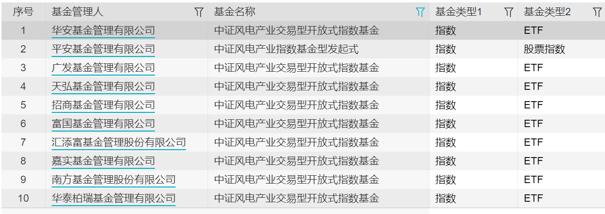 10月29日至11月1日,共有10只中证风电产业交易型开放式指数基金申报,其中,场内ETF共计9只,包括广发、天弘、嘉实等头部机构;场外发起式指数基金1只,为平安基金的中证风电产业发起式指数基金。