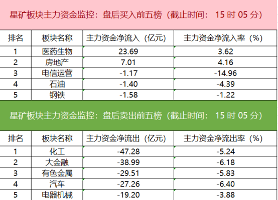 从主力板块资金监控数据来看,今日仅医药和房地产板块主力资金净流入,其余所有板块主力资金均净流出。医药板块午后异动拉升,沃森生物、恒瑞医药等权重大涨,目前来看医药股仍是超跌反弹状态,趋势能否反转仍需观察。