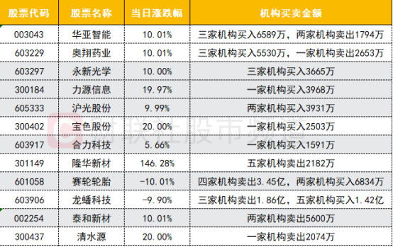 今日龙虎榜机构买入个股所属板块较为杂乱,其中近期连板股华亚智能、沪光股份、合力科技获机构高位加仓,与昨日龙虎榜类似,近期市场连板股成功率及溢价均有所提升,使得机构敢于在高位介入。今日两只个股遭机构大幅卖出,其中汽车零部件概念股赛轮轮胎遭机构卖出超3亿,该股近一段时间累计涨幅较大,或是有机构选择兑现离场。龙蟠科技今日遭机构激烈博弈,机构卖出和买入金额相差不多,该股近期连续大跌,有机构离场的同时也有机构选择逆势买入,接下来可关注该股能否迎来超跌反弹。