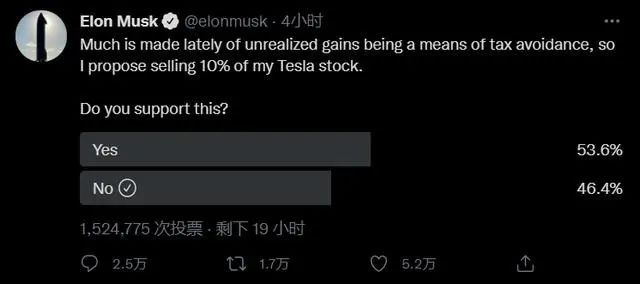 上周双休日,“马斯克欲出售特斯拉股票”相关消息已在互联网上“沸腾”。当地时间11月7日,马斯克在社交媒体上发起投票,询问6270万粉丝,自己是否该出售10%的特斯拉股票,并表示将“遵守投票结果”。截至8日投票结束,有近5成以上网友选择“赞成”。