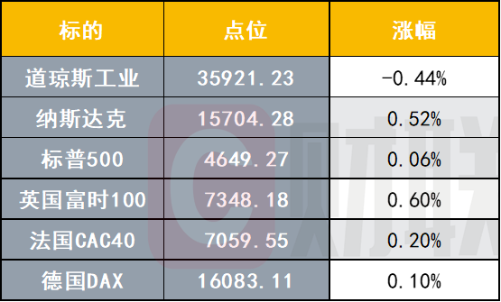 美三大指数涨跌不一,标普指数和纳指双双反弹,道指延续跌势。截至收盘,道琼斯指数跌0.44%,报35,921.23点;标普500指数涨0.06%,报4,649.27点;纳斯达克指数涨0.52%,报15,704.30点。板块方面,大型科技股涨跌互现,新能源汽车股集体大涨,热门中概股普遍上涨。