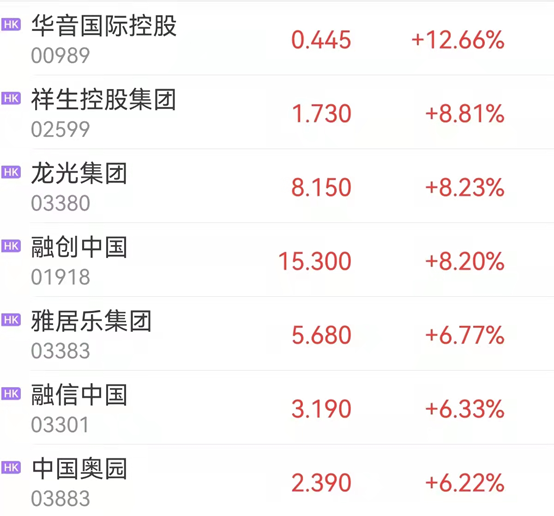 同时受昨日市场重锤的地产板块迎来反弹,该板块上涨3.24%,其中华音国际控股(00989)和祥生控股集团(02599)涨幅领先,其分别为12.66%和8.81%。